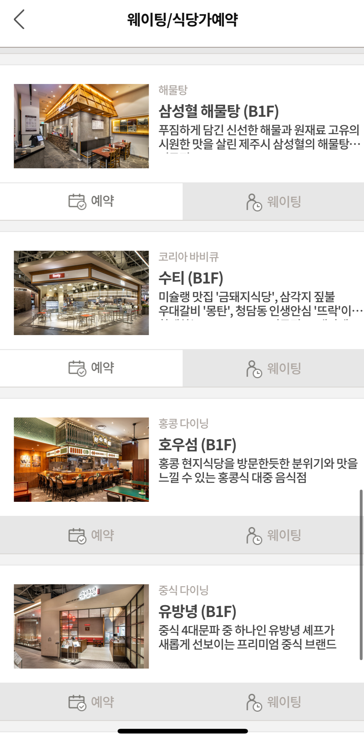 더현대 식품관 앱을 다운 받으신 후에 회원가입 및 로그인을 하시면 메인에 있는 웨이팅/예약에서 음식점 리스트가 나옵니다.
